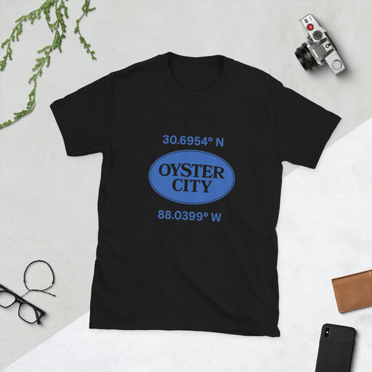 Oyster City - Mobile Front Logo, Lat & Long. – Short Sleeve Tee - Gildan